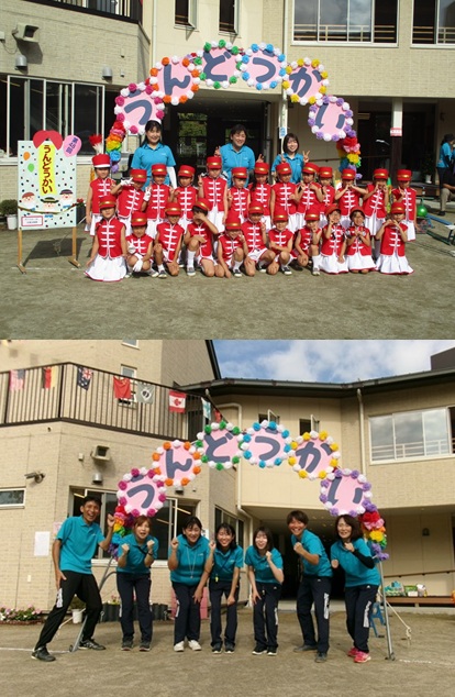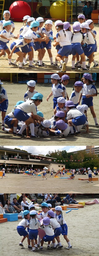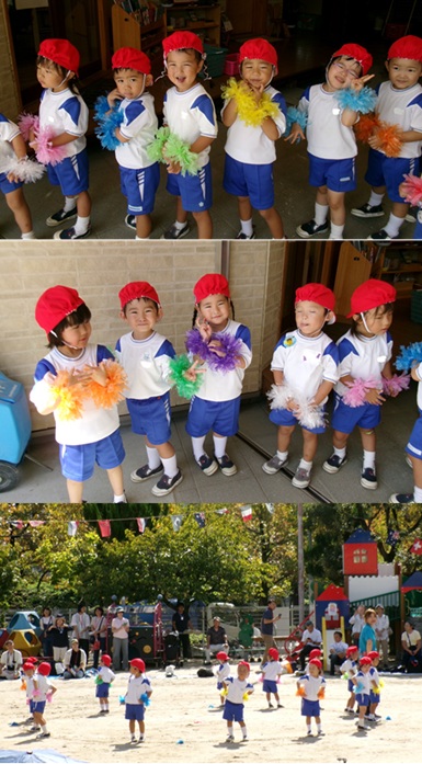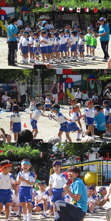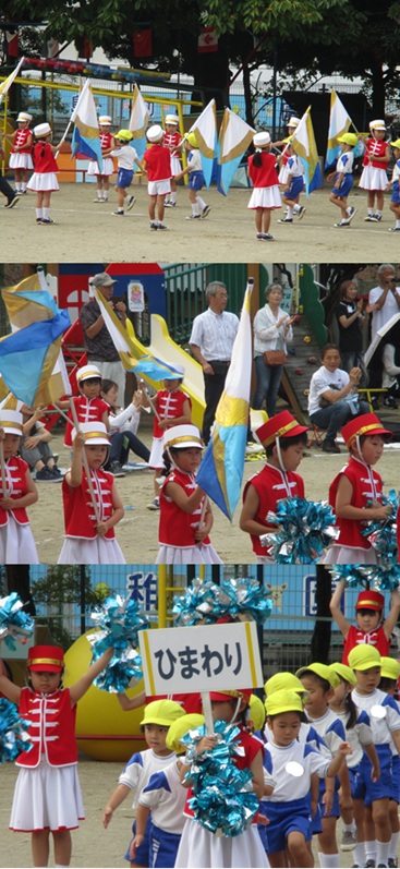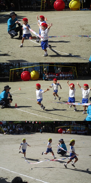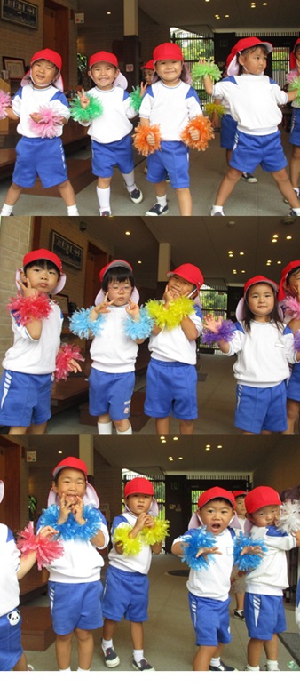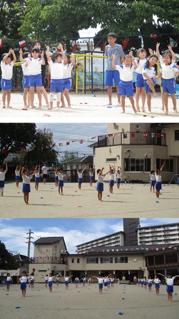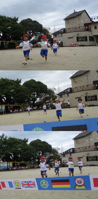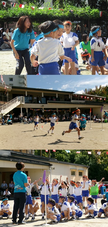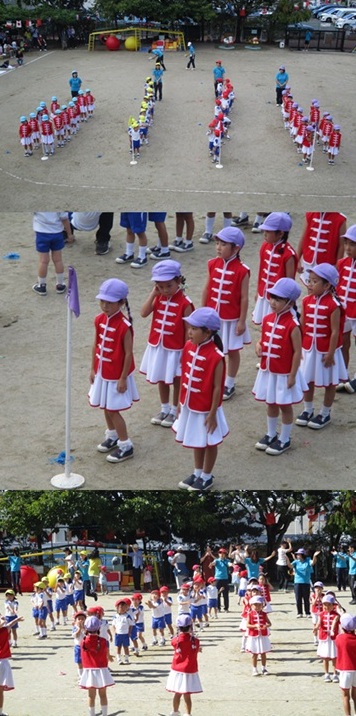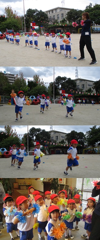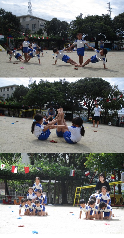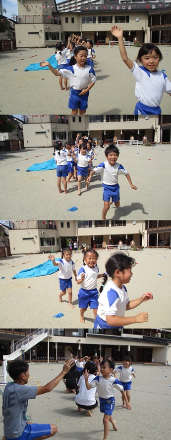 2度の延期を経て、待ちに待った運動会の開催。 統計史上最も暑い夏を配慮しながら進めてきました。 初めのうちは、友だちと走ったり、ダンスをしたりと楽しんでいた子どもたちも、どんどん運動会への期待を持つようになりました。4歳児、5歳児ともなると見通しをもち、自分の役割を果たして友だちと協力してやり遂げようとする場面も沢山見受けられ嬉しく思いました。 今では運動会を再現し、園庭はいつも賑やかです。 |