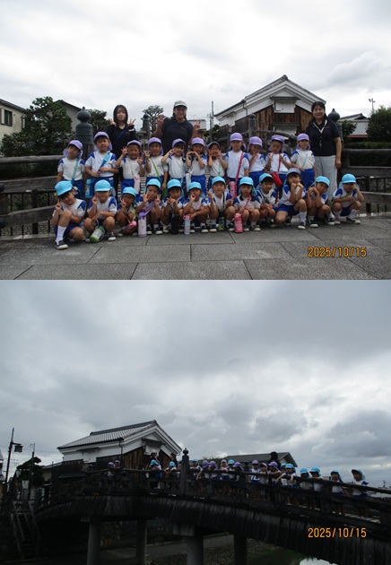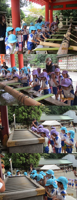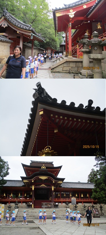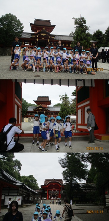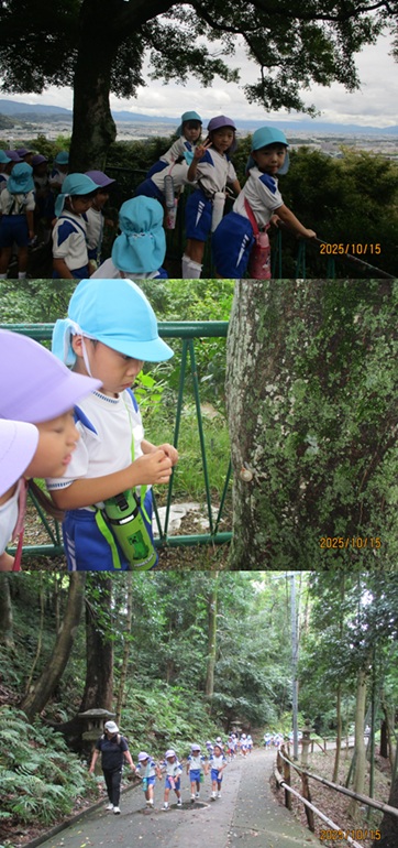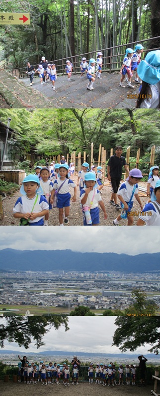 年長児の園外保育は、日本三大八幡宮のひとつ 国宝の石清水八幡宮へ行きました。山頂までは555段の階段がある裏参道を1段1段登って行きました。5歳児が自分の足で登り切るには少し頑張らなくてはいけませんが、運動会で諦めない気持ちが強くなったのでしょう。誰ひとりリタイアする子どもはいませんでした。 |