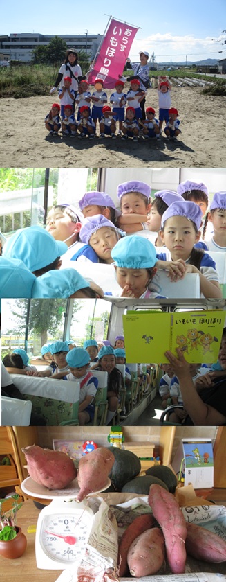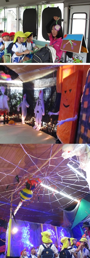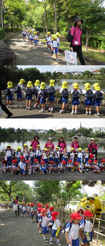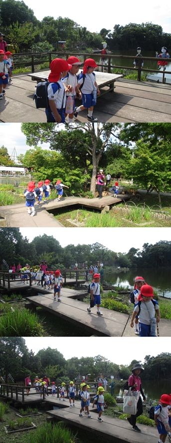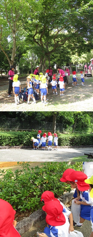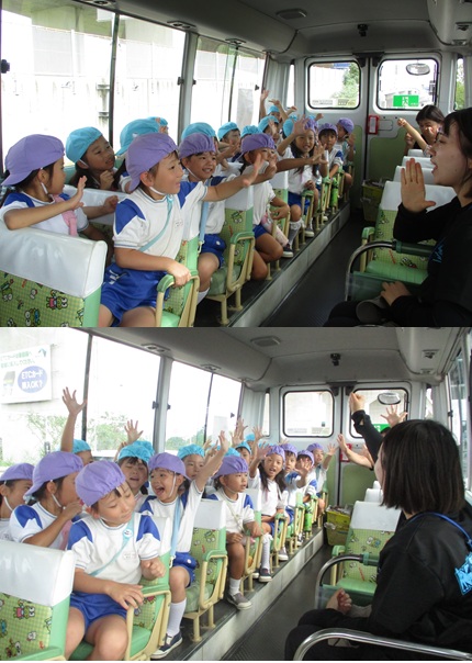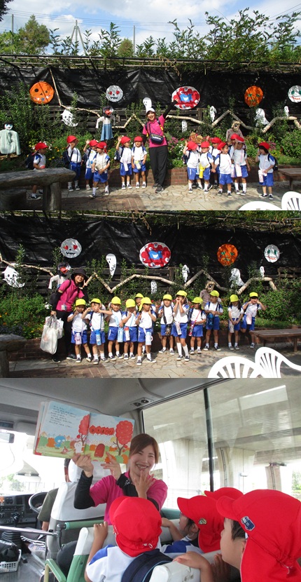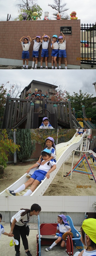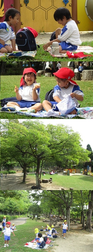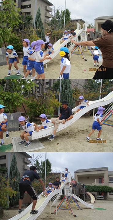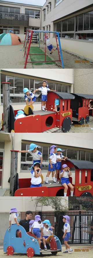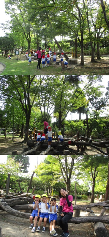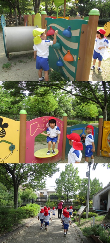 再びバスに乗り、姉妹園『なるみ幼稚園』に遊びに行きました。ローラー滑り台、ログハウス、ぽっぽちゃんという汽車に乗ったり、鬼ごっこ等をし、555段も階段を登ったとは思えないパワー全開であそんでいました。 |