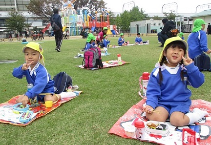 幼稚園最後のお弁当も、お膝から落とさないよう大事に味わっていただきました。 |