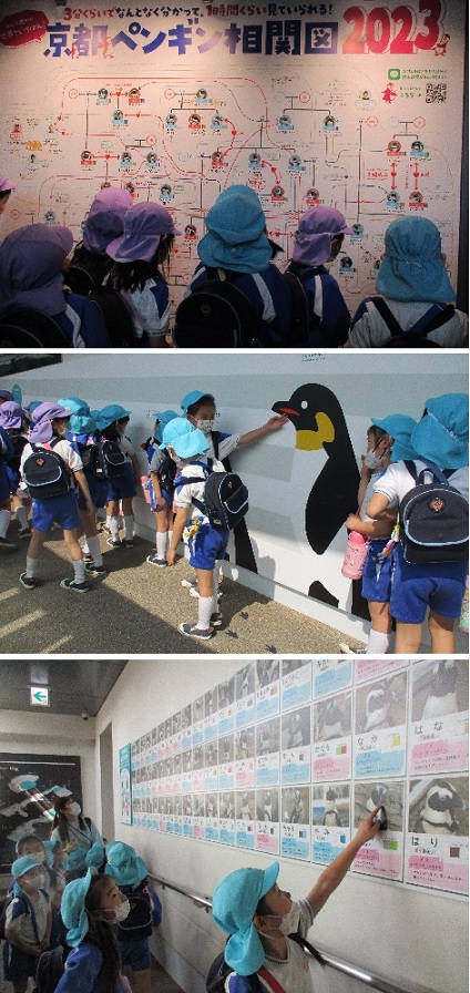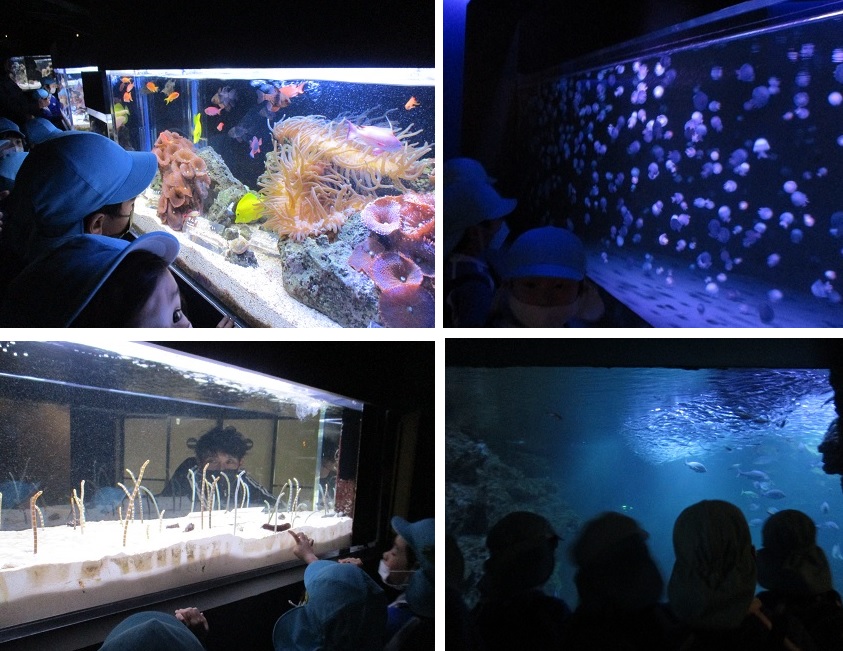チンアナゴ・ペンギン・クラゲ...何もかも興味津々。エイは、ついつい子どもの笑顔を誘うような腹を見せ、イワシの群れでは「スイミーみたい」と水槽にはりつくように見ていました。 |