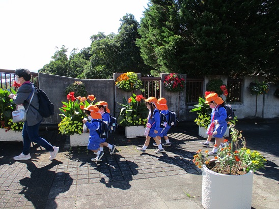 澄み渡る空、朝から嬉しさを隠しきれないくらいの笑顔で登園してきました。遠足の日ですもの。カバンにはお家の方につくっていただいた、お弁当とおやつが入っています。 |