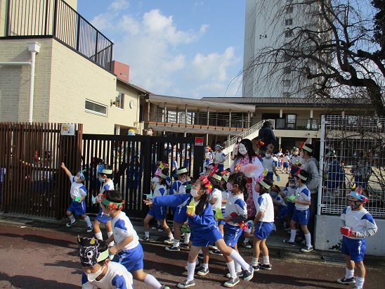 2月3日は節分「豆まき」をしました。お面や三方づくりは、この日までに準備万端です。鬼の“的”に新聞紙で作った豆を当てて遊んだり、当日の作戦会議をし、特に前の年のことを知っている年中、年長児は半分、怖さもあるようでした。 |