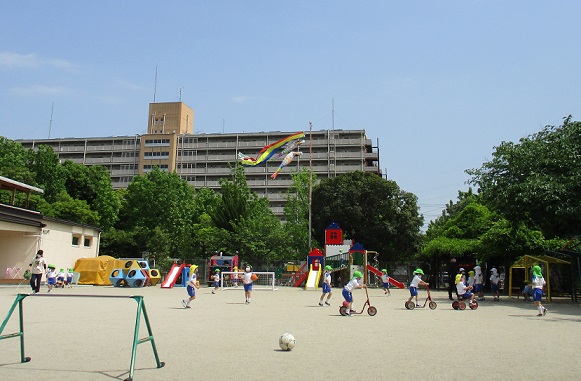 太陽の光がさす園庭では、全員で最後の追い出しにかかります。 |