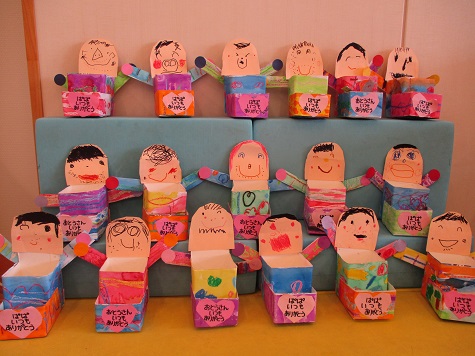 桃の節句にと、各クラスでは次々と手作りひな人形が出来上ってきました。子どもたちの手が入ったものはいつも愛らしく、きっとお家でも飾りながら♪あかりをつけましょぼんぼりに~♪と、口ずさんでいたのではと想像しています。 |